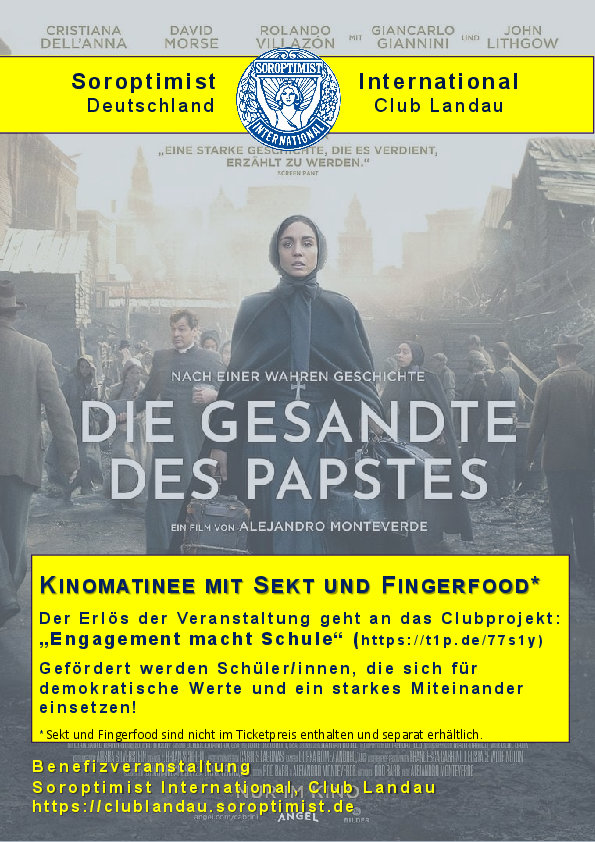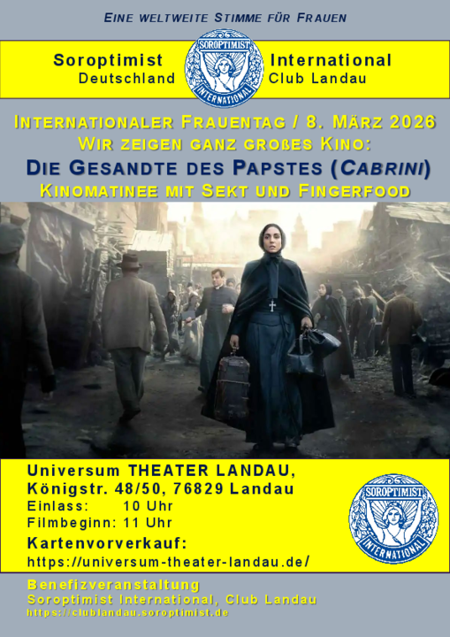 Landauer Soroptimistinnen feiern den internationalen Frauentag am 8. März mit großem Kinoevent – dem Film „Die Gesandte des Papstes“ und schönen Gesprächen beim Sekt- und Fingerfood-Empfang.